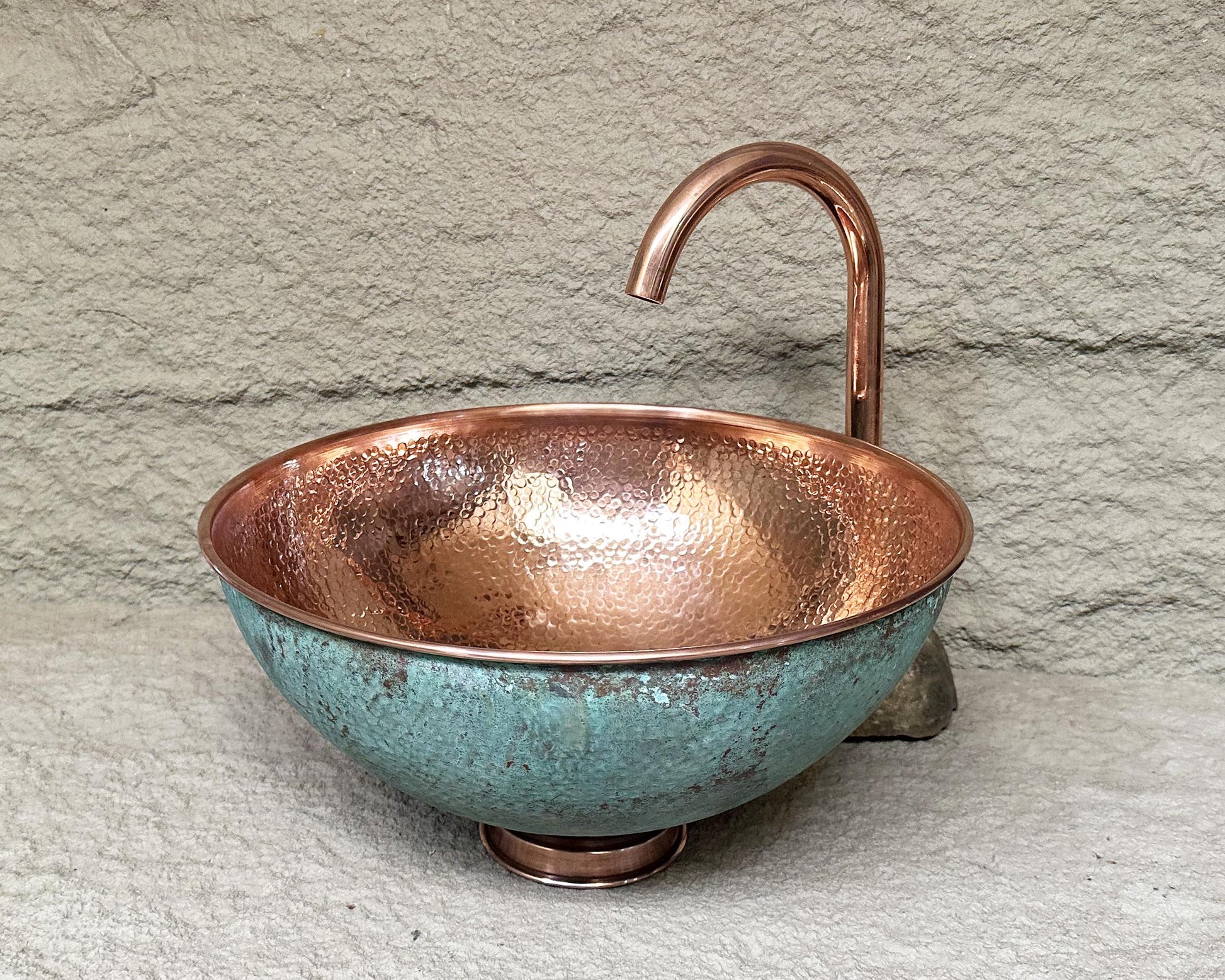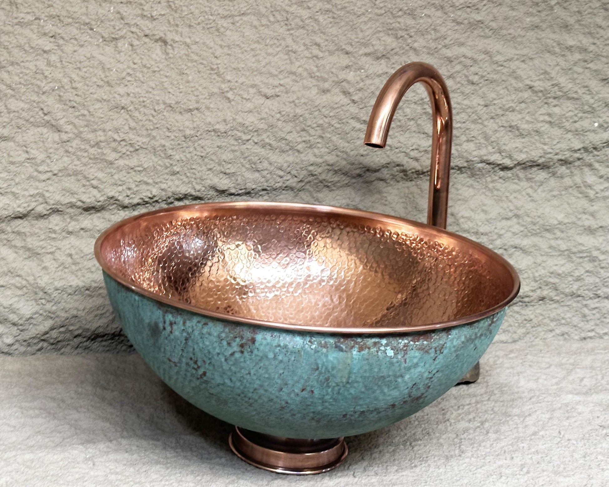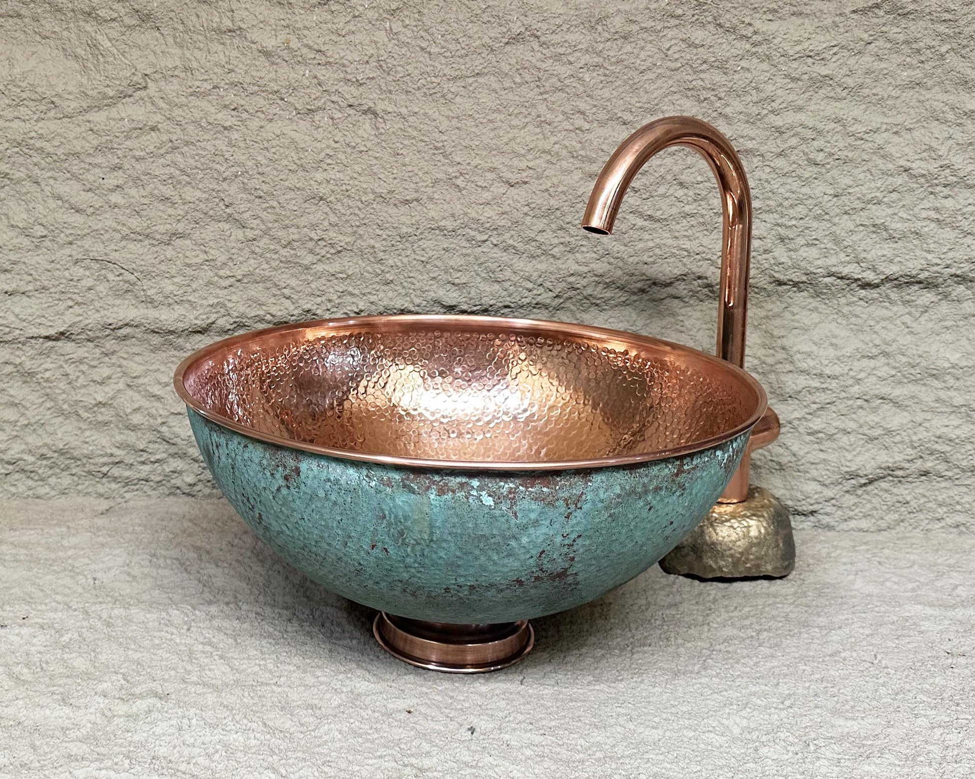 This vessel sink for bathroom has a green patina exterior, it's fully customizable to fit any client bathroom.