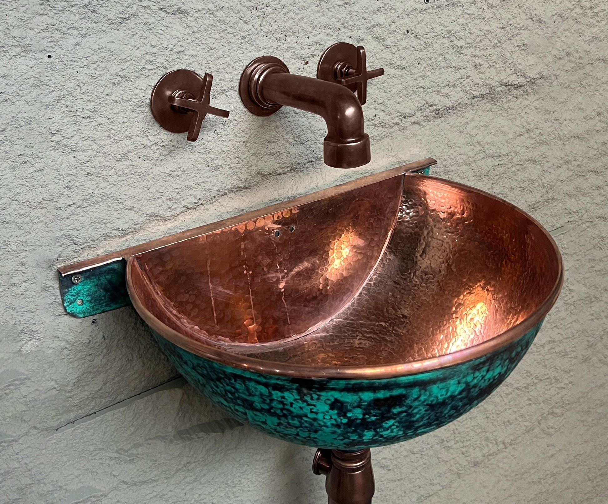 Oxidized Copper Wall Mounted Bathroom Sink, Green Patina Copper Hung Basin with Faucet