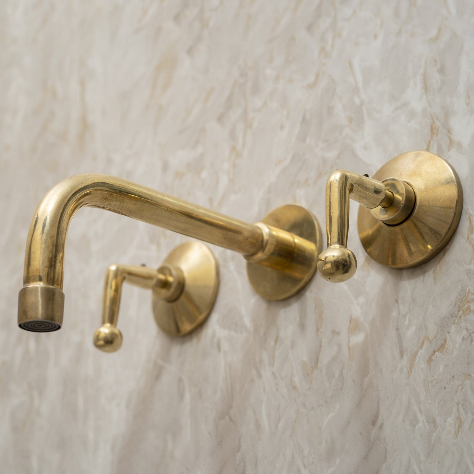Unlacquered Brass Wall Mounted Faucet, 3 Hole Bathroom Sink Faucet
