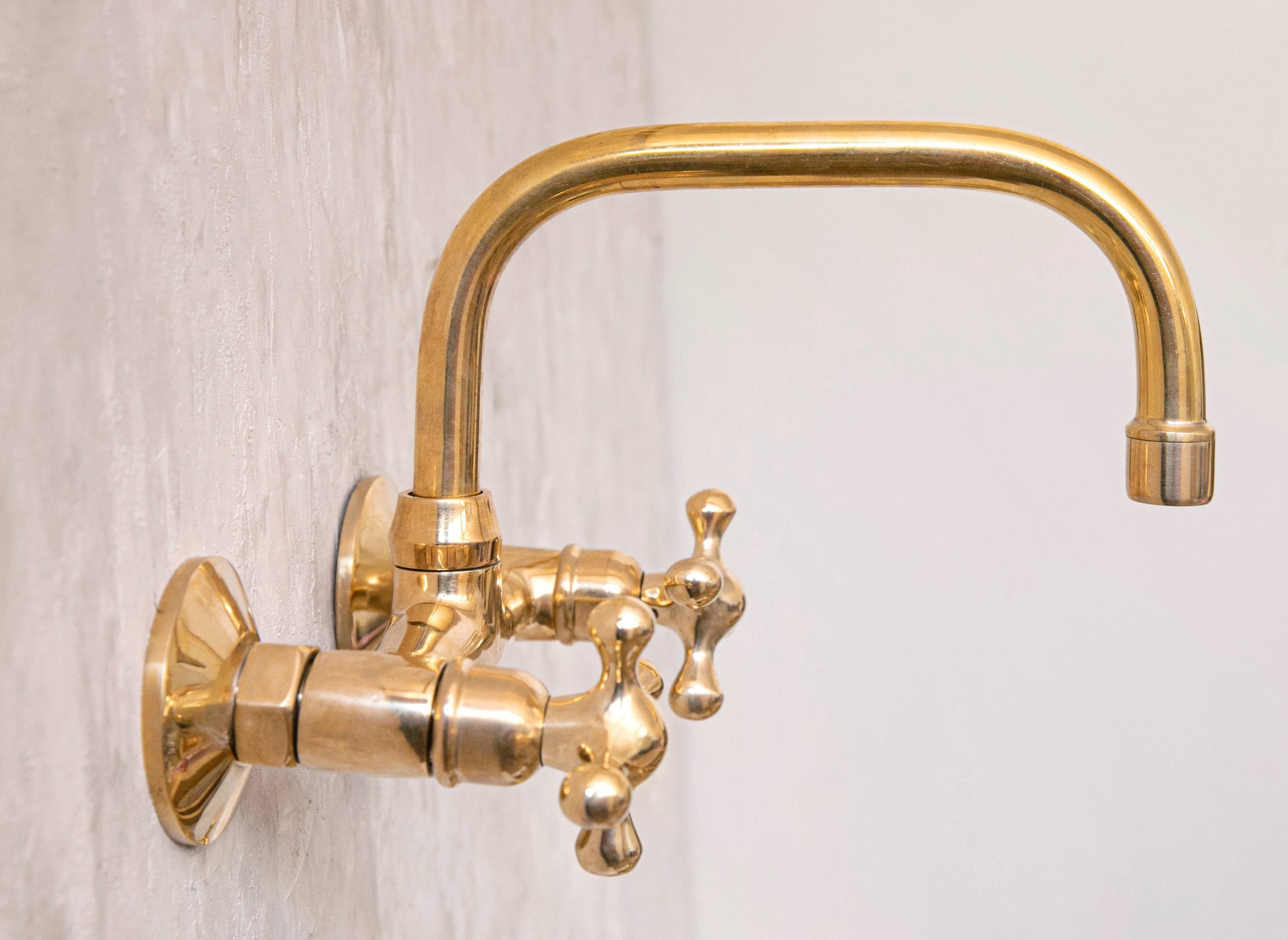 Wall mount Bath faucet in unlacquered brass is a perfect fit for a vessel or drop-in sink in your modern bathroom or kitchen.